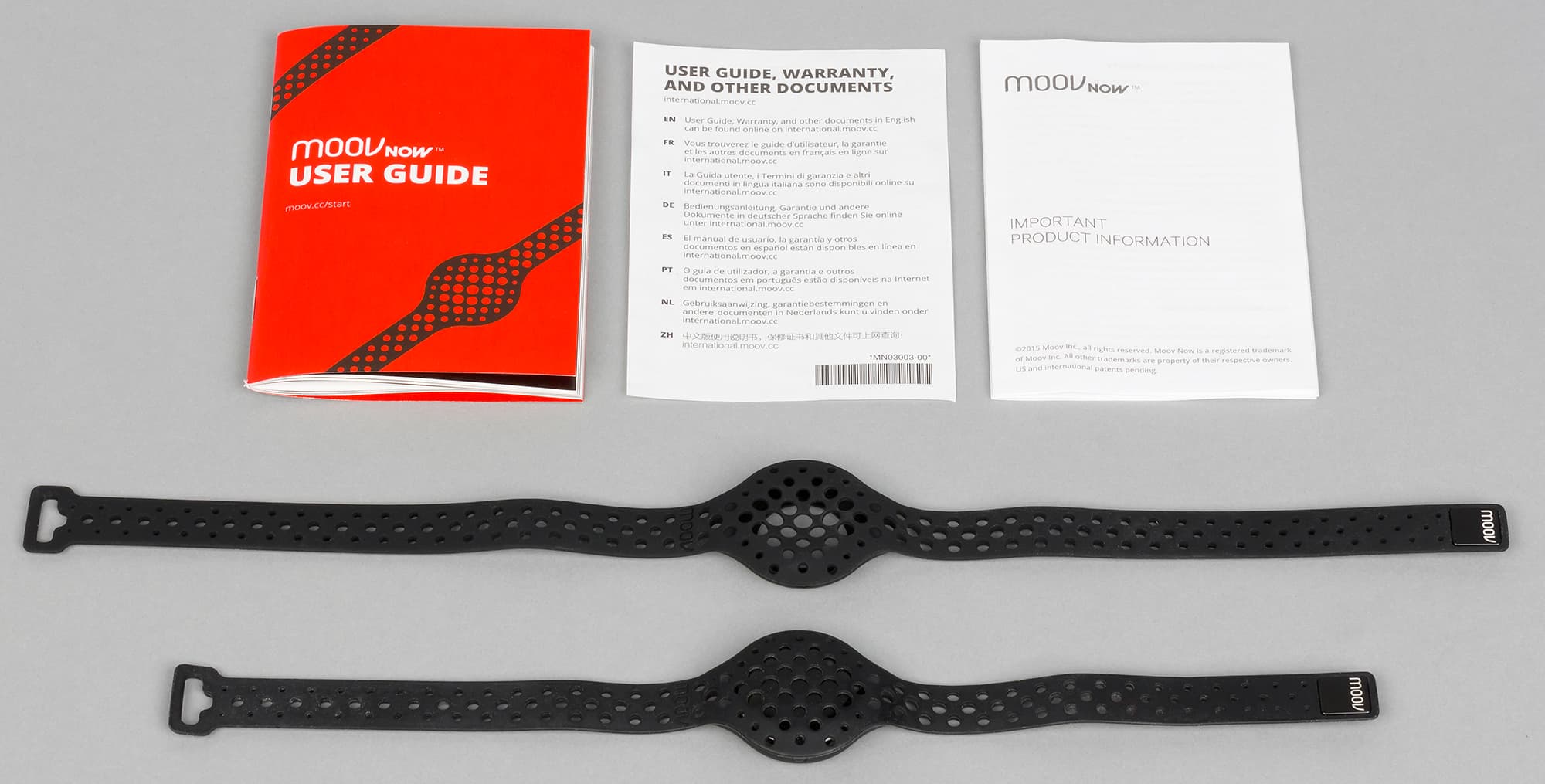 Комплектация довольно минималистична: это Moov Now, два ремешка (22,5 см и 32,5 см), две листовки и буклетик с руководством пользователя — увы, без русского языка.