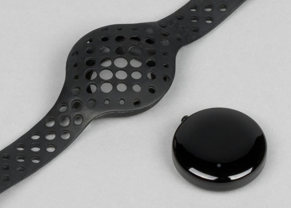 Конструкция самого электронного блока предельно простая: внутри корпуса из глянцевого черного пластика — батарейка CR2032, датчик движения, модуль Bluetooth, который активируется нажатием на корпус (он немного продавливается под нажатием). Именно нажатие запускает подключение к смартфону и синхронизацию.