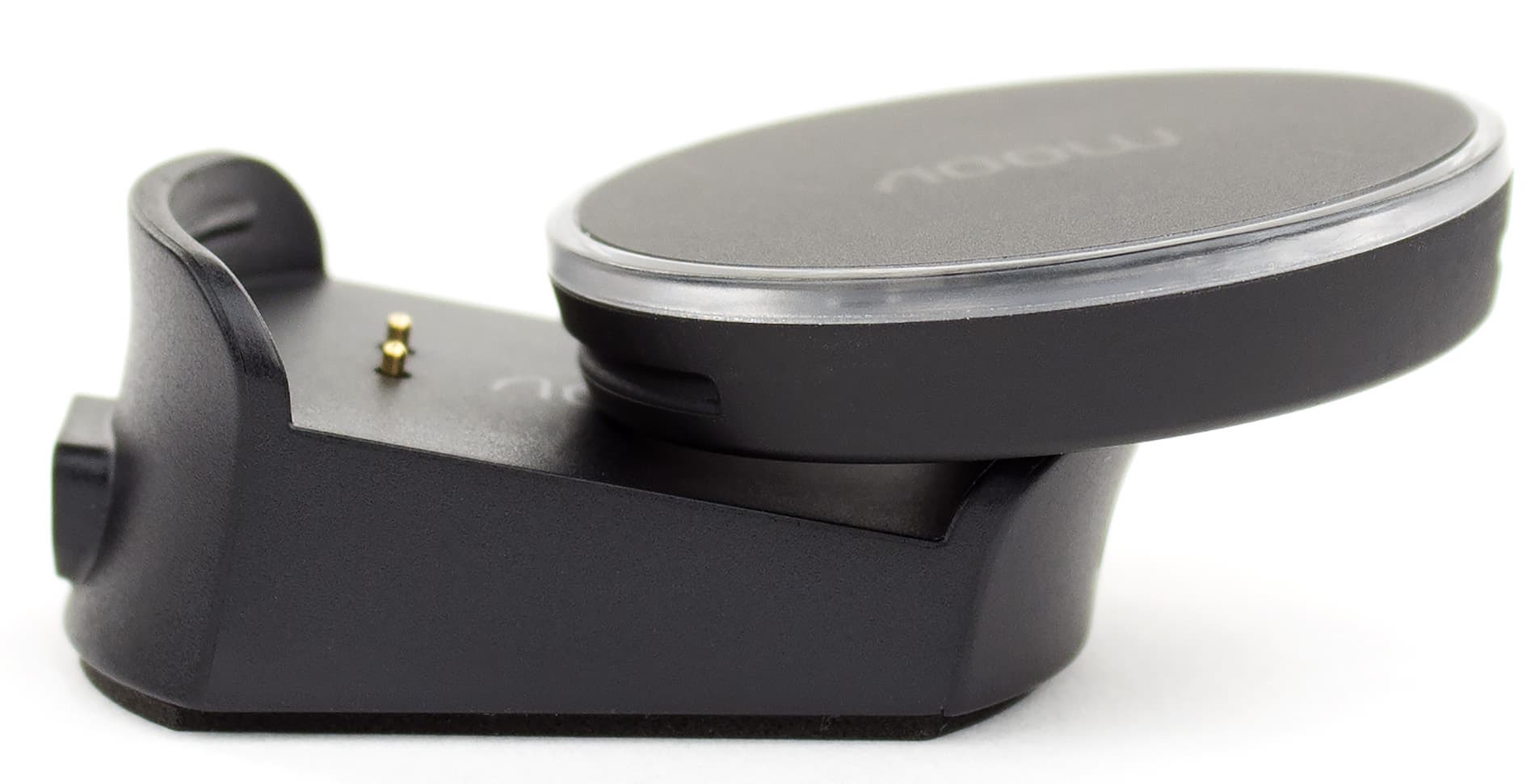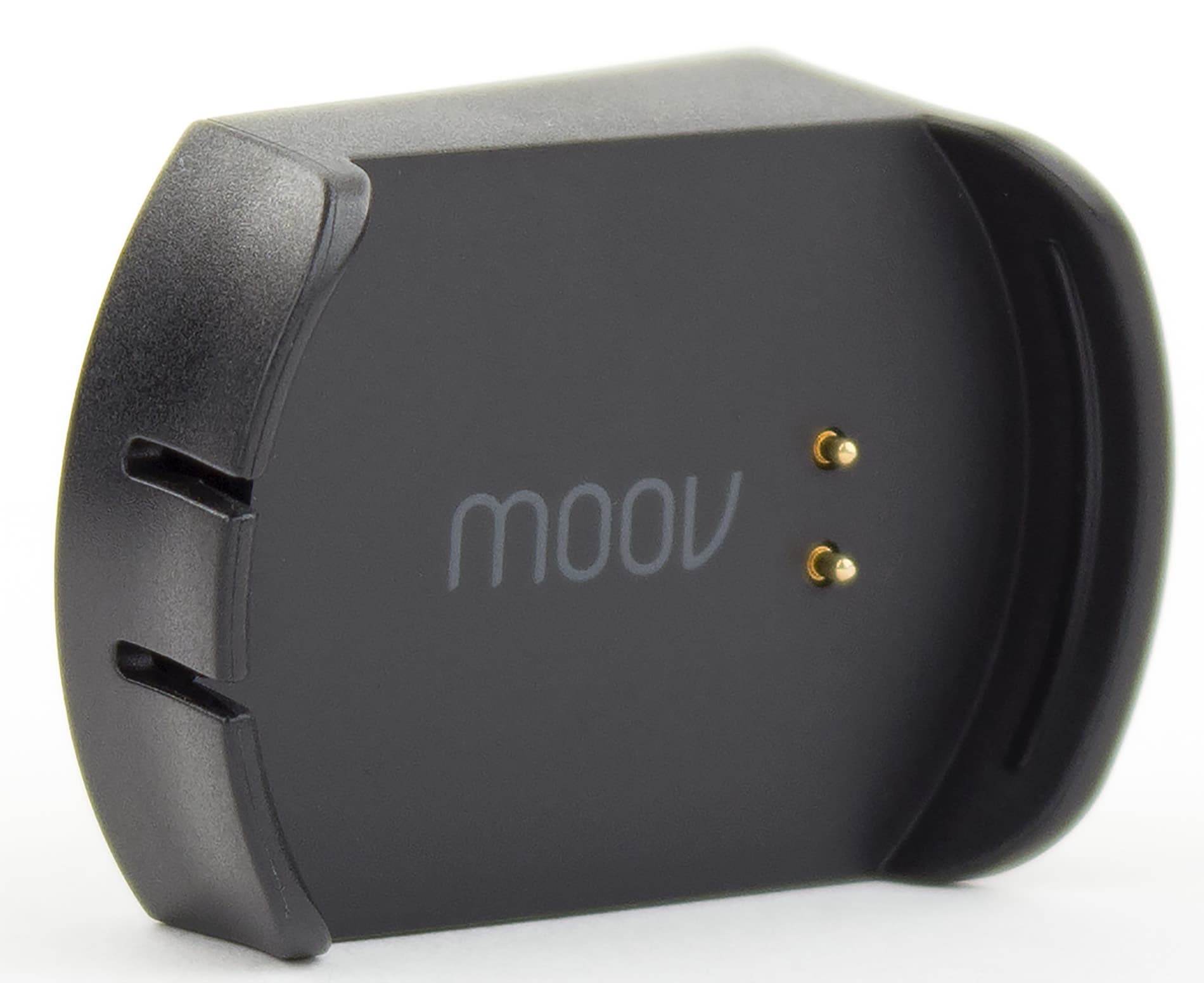 Для того, чтобы зарядить устройство, надо закрепить его в зарядном крэдле таким образом, чтобы совпали два металлических контакта. Затем подключаем зарядный крэдл с закрепленным в нем Moov к кабелю, а кабель — к любому зарядному устройству для смартфонов (в комплект зарядка не входит).