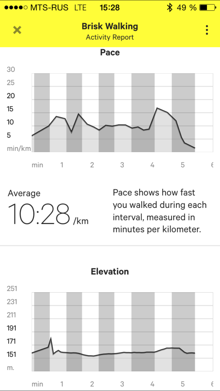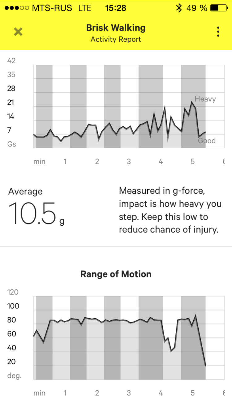 По окончании тренировки или прогулки вы можете посмотреть подробный отчет: с графиками по каждому отслеживаемому параметру и общей статистикой (суммарное время движения, количество шагов, пройденная дистанция, сожженные калории).