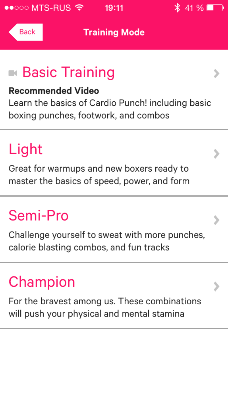 Прежде всего, вам предлагается посмотреть видео, где будет наглядно показано, какие бывают удары, как надо ставить ноги и т.п. После просмотра видео вы можете выбрать один из трех режимов: легкий (для новичков), полупрофессиональный и «чемпион». После выбора режима можно приступать к тренировке. Здесь уже вам не понадобятся наушники, но потребуется разместить смартфон где-то на уровне глаз, чтобы экран был постоянно в поле зрения. Конечно, удобнее, если это будет iPad, но, увы, отдельного приложения для iPad нет — вместо этого просто предлагается запустить смартфонное приложение с двукратным увеличением. Впрочем, если поставить планшет на некотором расстоянии от глаз, то дефекты изображения не очень будут бросаться в глаза.