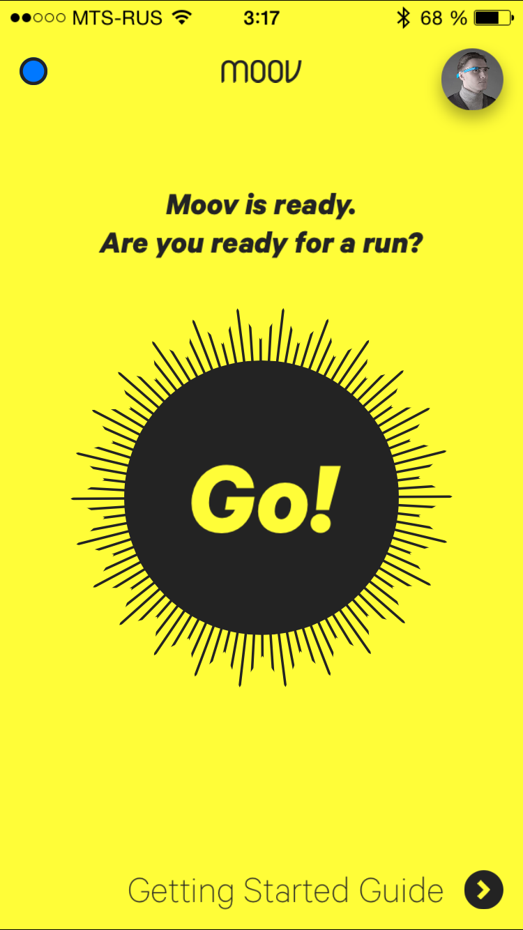 Для начала работы с устройством вы можете выбрать любое из доступных приложений. Разумеется, приложения полностью бесплатны. Запустив приложение, мы можем создать аккаунт или войти через Facebook (самый простой вариант). При этом, нам надо будет указать свой рост, вес и возраст, а также присвоить Moov имя и цвет индикации. Эта короткая первоначальная настройка требуется только при первом запуске любого из приложений. Затем вы можете запускать любое приложение — и для начала работы достаточно будет нажать на Moov и выбрать его в появившемся окне (если у вас несколько Moov, там будут отображаться все активные устройства).