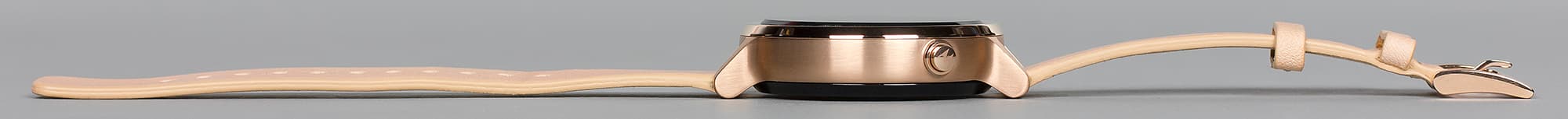Ремешок часов выполнен из тонкой мягкой кожи. Сообщается, что это натуральная кожа фирмы Horween. Цвет — светло-бежевый. С золотистым цветом корпуса он неплохо гармонирует. Кожа ремешка немного напоминает по своим свойствам ремешок из гладкой кожи «гранада» для Apple Watch, однако застежка здесь обычная, традиционная, да и сама кожа, видимо, менее тщательно выделана — на экземпляре, который был у нас на тестировании, можно заметить сгибы и «морщинки», хотя понятно, что часы были в использовании относительно недолго.