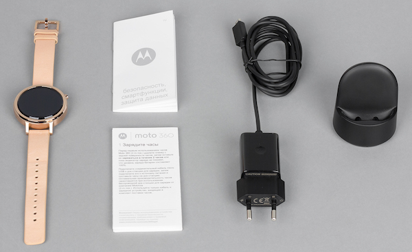 Также в комплекте две листовки с информацией о безопасности и первоначальной настройке часов. Показательно, что листовки на русском. Что касается беспроводной зарядки, то она в целом похожа на аналогичный элемент комплектации Moto 360 первого поколения, только поменьше. Но интересно, что новые часы без проблем заряжаются и от прошлой зарядки.