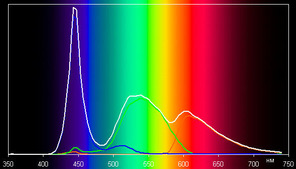 Углы обзора хорошие. Цветовая температура белого поля равна 7700 К, а отклонение от спектра абсолютно черного тела (ΔE) составляет 0,8 единиц. В целом это хорошие показатели для потребительского устройства. Подсветка светодиодная с типичным спектром для белой светодиодной подсветки с синим излучателем и желтым люминофором:
