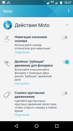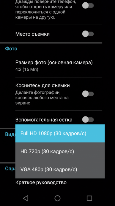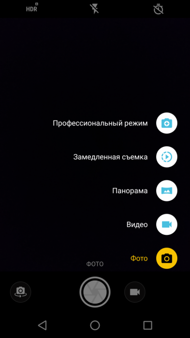 Меню стандартно для интерфейса смартфонов Moto, оно не очень сложное, интуитивно понятное и наглядное. Имеется Профессиональный режим, который выводит дугообразные ползунки с изменяемыми значениями выдержки, светочувствительности (до ISO 3200), ручной фокусировки, баланса белого, шкалы экспокоррекции. Но даже в этом режиме нельзя штатно сохранять снимки в RAW.
