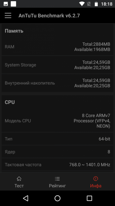 - SoC Qualcomm Snapdragon 430, 8 ядер Cortex-A53 (4@1,4 ГГц + 4@1,1 ГГц)