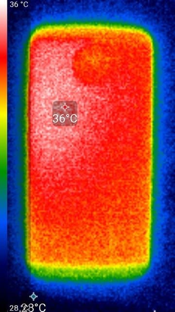 Нагрев чуть больше локализован в верхней правой части аппарата, что, видимо, соответствует расположению микросхемы SoC. По данным теплокамеры, максимальный нагрев составил 36 градусов (при температуре окружающего воздуха в 24 градуса), это относительно немного.