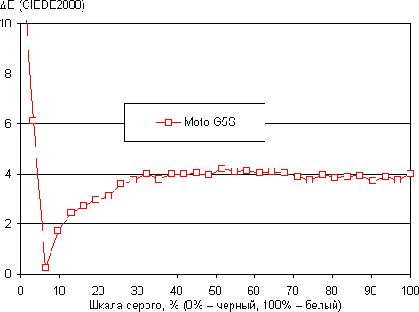 В итоге цвета имеют естественную насыщенность и оттенок. Баланс оттенков на шкале серого слегка компромиссный, так как цветовая температура значимо выше стандартных 6500 К, однако отклонение от спектра абсолютно черного тела (ΔE) на большей части шкалы серого ниже 10, что для потребительского устройства считается приемлемым показателем. При этом оба параметра несильно изменяются от оттенка к оттенку — это положительно сказывается на визуальной оценке цветового баланса. (Самые темные области шкалы серого можно не учитывать, так как там баланс цветов не имеет большого значения, да и погрешность измерений цветовых характеристик на низкой яркости большая.)