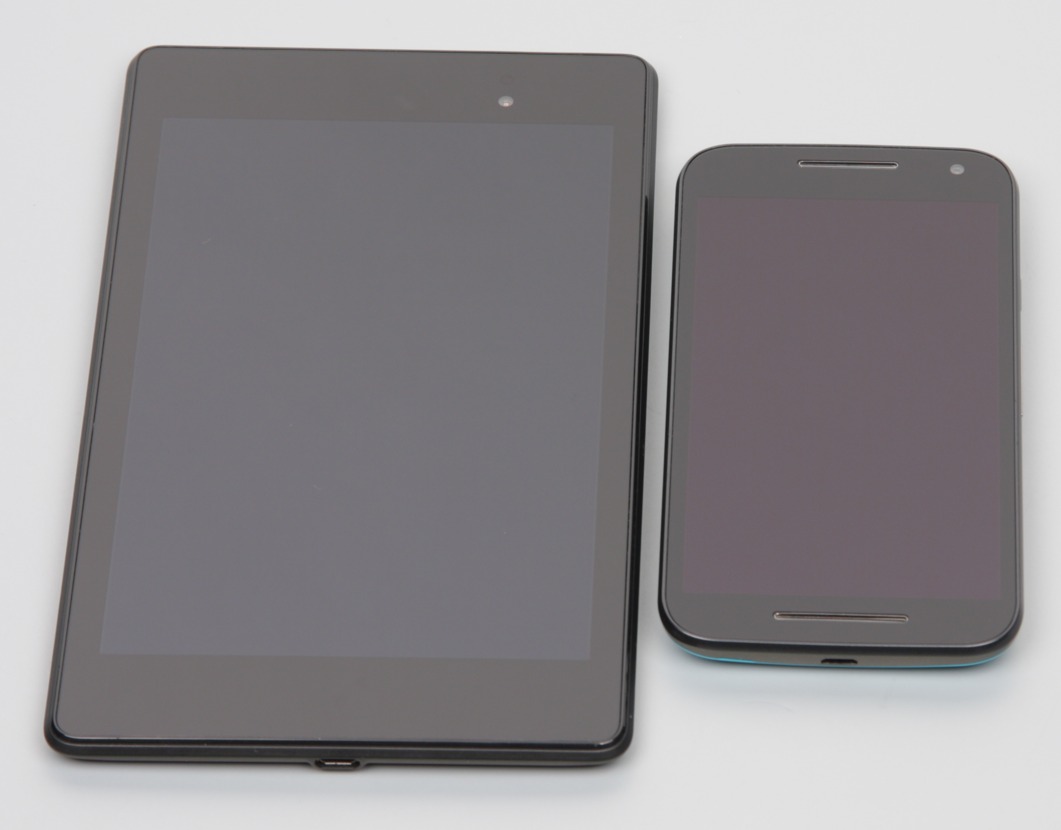 Лицевая поверхность экрана выполнена в виде стеклянной пластины с зеркально-гладкой поверхностью, устойчивой к появлению царапин. Судя по отражению объектов антибликовые свойства экрана лучше, чем у экрана Google Nexus 7 (2013) (далее просто Nexus 7). Для наглядности приведем фотографию, на которой в выключенных экранах отражается белая поверхность (слева — Nexus 7, справа — Motorola Moto G, далее их можно различать по размеру):