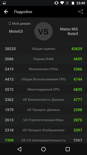 По производительности в бенчмарках Moto G довольно-таки слаб, из достойных современных аппаратов сравнить его, в принципе, и не с чем: смартфон выдает около 28К очков в AnTuTu и всего 6 fps в одном из самых простых режимов графического теста GFX.