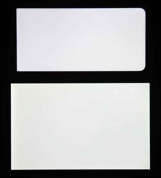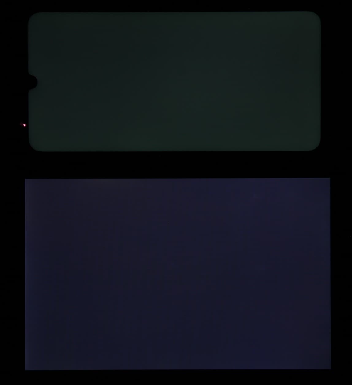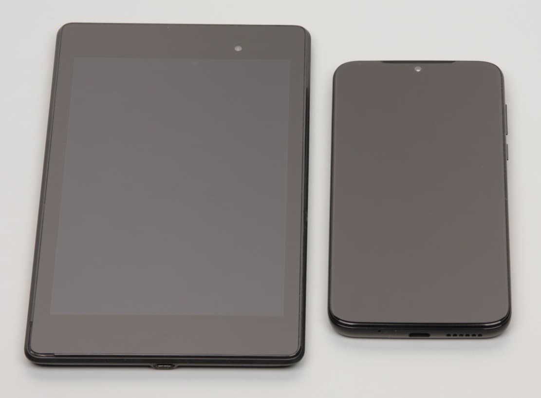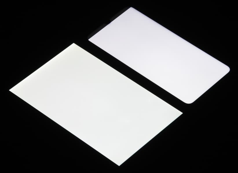 Лицевая поверхность экрана выполнена в виде стеклянной пластины с зеркально-гладкой поверхностью, устойчивой к появлению царапин. Судя по отражению объектов, антибликовые свойства экрана лучше, чем у экрана Google Nexus 7 (2013) (далее просто Nexus 7). Для наглядности приведем фотографию, на которой в выключенных экранах отражается белая поверхность (слева — Nexus 7, справа — Motorola Moto G8 Plus, далее их можно различать по размеру):