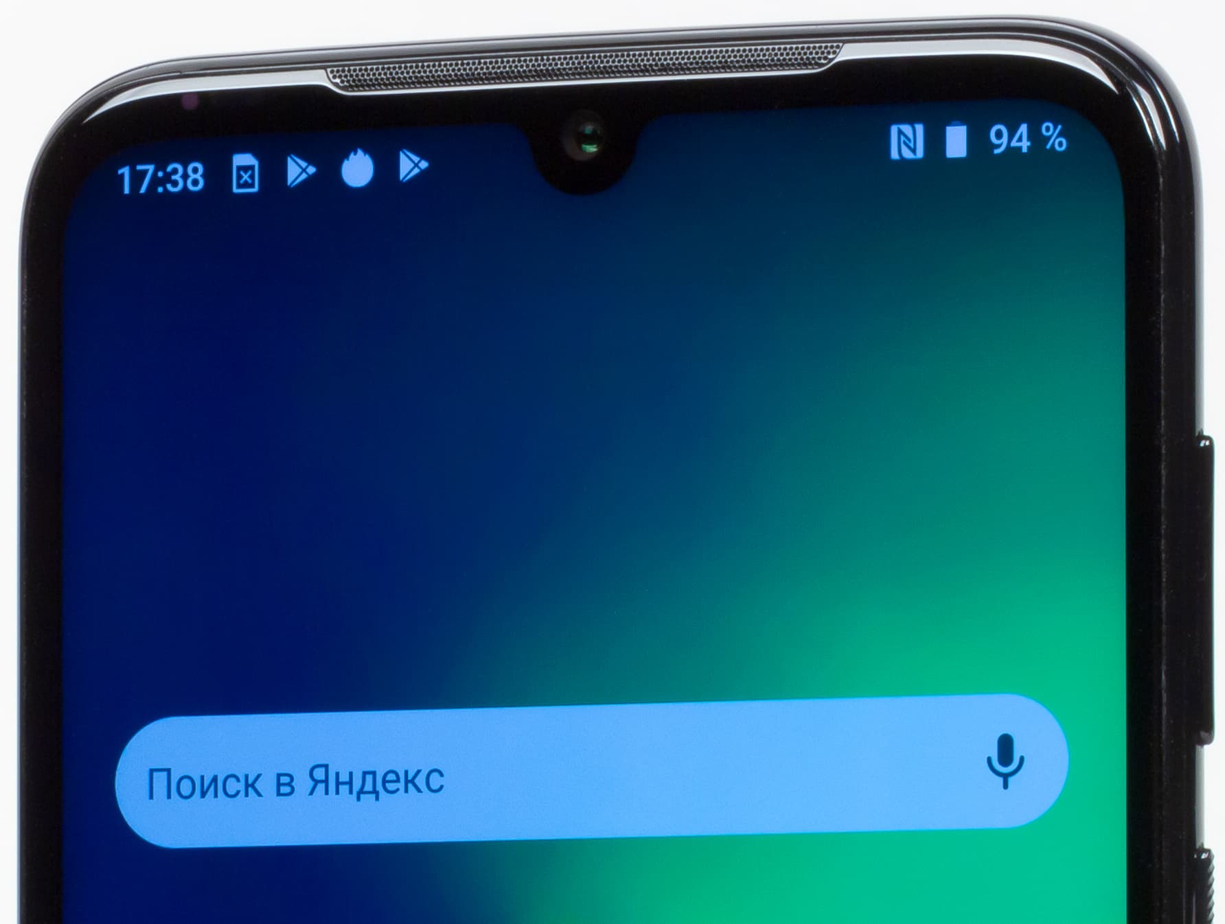 Фронтальный модуль камеры обустроен в ставшем уже привычным каплевидном вырезе в экране. Модуль здесь одиночный, а следовательно, он не может обеспечить стопроцентную защиту при авторизации по лицу. Щель для динамика очень широкая, что позволяет сделать предположение о наличии мощного разговорного динамика.
