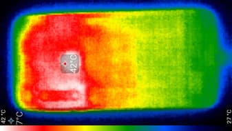 Нагрев больше в правой части аппарата, что, видимо, соответствует расположению микросхемы SoC. По данным теплокамеры, максимальный нагрев составил 42 градуса (при температуре окружающего воздуха в 24 градуса). Такой нагрев нельзя назвать незначительным.