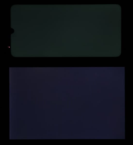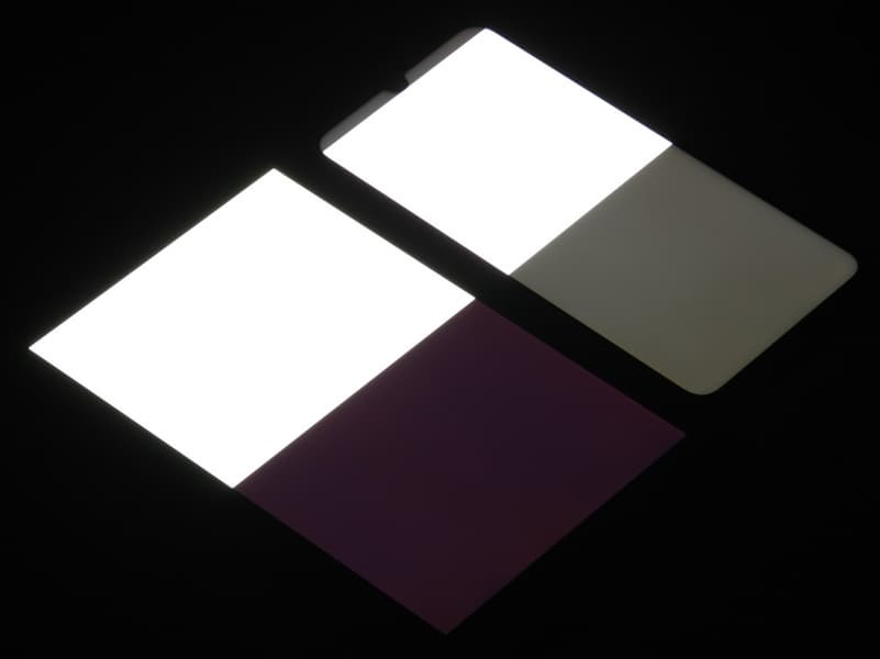 Экран имеет хорошие углы обзора без значительного сдвига цветов даже при больших отклонениях взгляда от перпендикуляра к экрану и без инвертирования оттенков. Для сравнения приведем фотографии, на которых на экраны Motorola Moto G8 Plus и Nexus 7 выведены одинаковые изображения, при этом яркость экранов изначально установлена примерно на 200 кд/м², а цветовой баланс на фотоаппарате принудительно переключен на 6500 К.