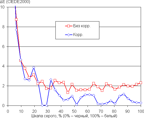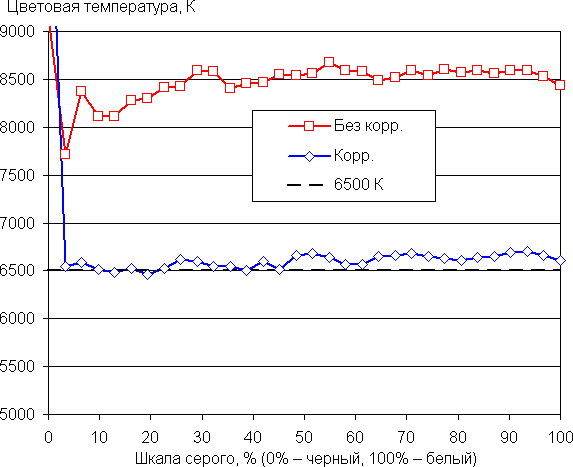 В принципе, яркий свет может приводить к нарушению суточного (циркадного) ритма (см. статью про iPad Pro с дисплеем 9,7 дюйма), но все решается подстройкой яркости до комфортного уровня, а искажать цветовой баланс, уменьшая вклад синего, нет абсолютно никакого смысла. Впрочем, данную настройку можно использовать для коррекции цветового баланса, так как по умолчанию цветовая температура высоковата, порядка 8500 К. Результат после коррекции хороший (см. графики ниже, а положение ползунка — на изображении выше), поскольку цветовая температура становится несильно выше стандартных 6500 К, а отклонение от спектра абсолютно черного тела (ΔE) даже ниже 3, что для потребительского устройства считается отличным показателем. При этом цветовая температура и ΔE мало изменяются от оттенка к оттенку — это положительно сказывается на визуальной оценке цветового баланса. (Самые темные области шкалы серого можно не учитывать, так как там баланс цветов не имеет большого значения, да и погрешность измерений цветовых характеристик на низкой яркости большая.)