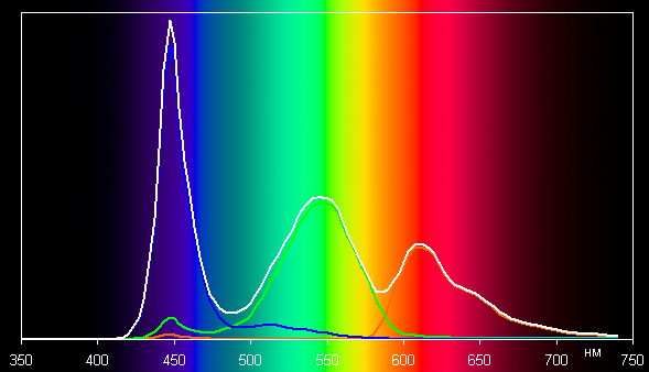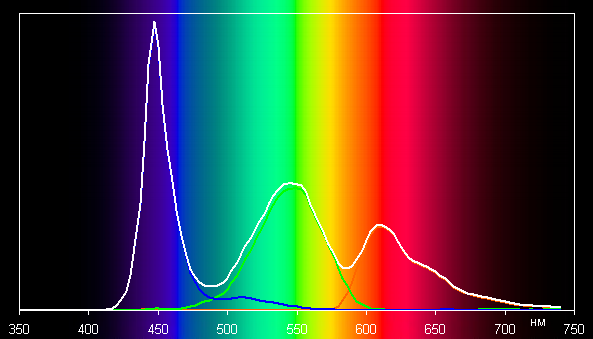 При этом горбы зеленого и красного цветов относительно хорошо разделены, что и приводит к некоторому уширению цветового охвата.