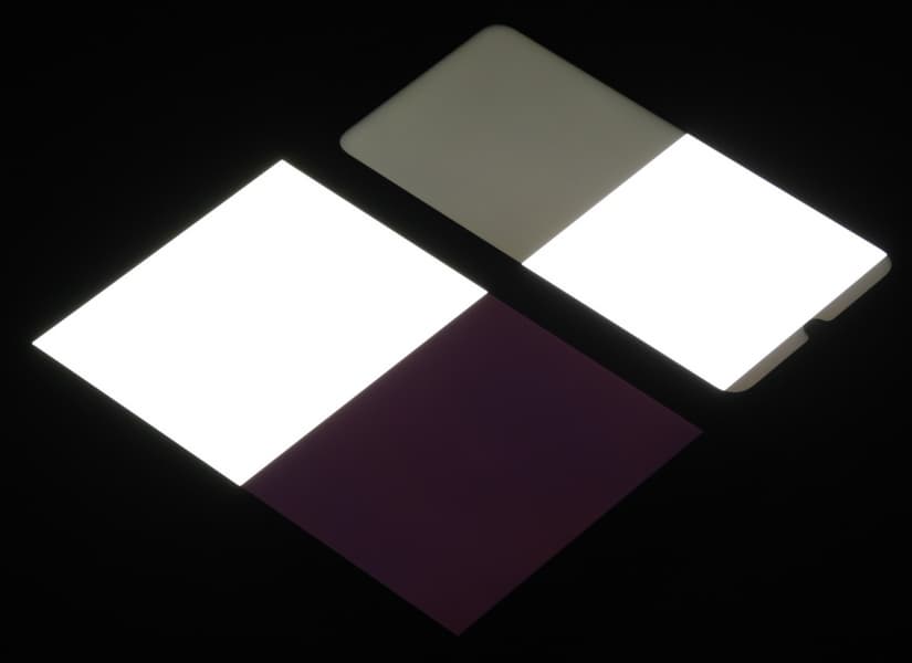 Яркость под углом у экранов уменьшилась (как минимум в 5 раз, исходя из разницы в выдержке), и уменьшилась примерно одинаково. Черное поле при отклонении по диагонали сильно высветляется, но остается условно нейтрально-серым. Фотографии ниже это демонстрируют (яркость белых участков в перпендикулярном плоскости экранов направлении одинаковая!):