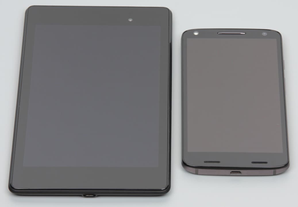 Лицевая поверхность экрана выполнена в виде стеклянной пластины с зеркально-гладкой поверхностью, устойчивой к появлению царапин. Судя по отражению объектов антибликовые свойства экрана не хуже, чем у экрана Google Nexus 7 (2013) (ниже просто Nexus 7). Для наглядности приведем фотографию, на которой в выключенных экранах отражается белая поверхность (слева — Nexus 7, справа — Moto X Force, далее их можно различать по размеру):