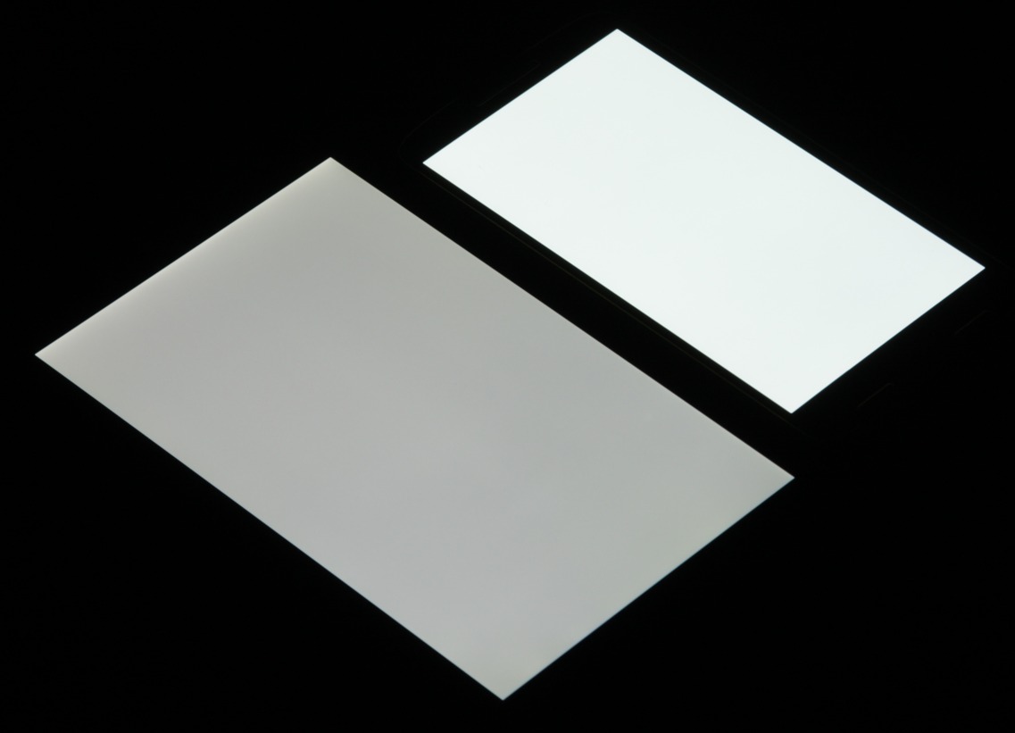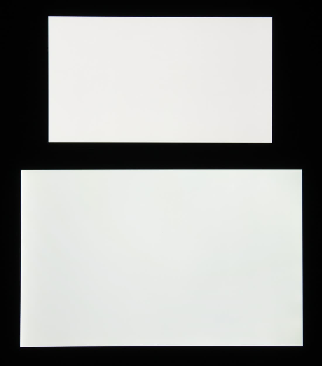 Экран характеризуется великолепными углами обзора. Правда, белый цвет при отклонении даже на небольшие углы приобретает легкий сине-зеленый оттенок, а под некоторыми углами чуть-чуть розовеет (хотя этот эффект и выражен гораздо слабее, чем обычно бывает у AMOLED), но черный цвет остается просто черным под любыми углами. Он настолько черный, что параметр контрастности в данном случае просто неприменим. Для сравнения приведем фотографии, на которых на экраны Moto X Force и второго участника сравнения выведены одинаковые изображения, при этом яркость экранов изначально установлена примерно на 200 кд/м², а цветовой баланс на фотоаппарате принудительно переключен на 6500 К. Перпендикулярно к экранам белое поле: