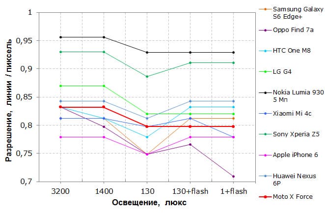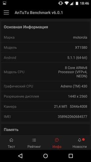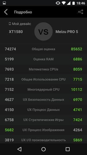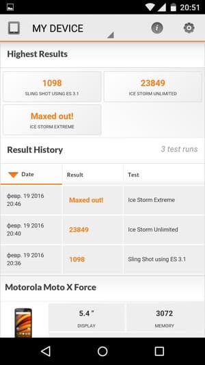 Платформа топового уровня Qualcomm Snapdragon 810 вполне способна конкурировать с современными альтернативными флагманскими решениями, такими как HiSilicon Kirin 935, MediaTek MT6795 и Exynos 7420 в плане графики, но по общей производительности CPU в комплексных тестах она сейчас не на первых местах. В любом случае смартфон Moto X Force по производительности находится на флагманском уровне, его аппаратных возможностей еще в течение нескольких поколений будет хватать для выполнения любых задач, в том числе и требовательных игр, хотя уже сейчас на арену выходят устройства с SoC Snapdragon 820, сменяющей платформу, на которой работает герой обзора.
