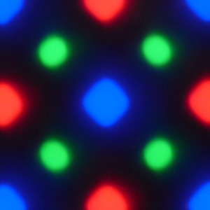 В этом экране используется матрица AMOLED — активная матрица на органических светодиодах. Полноцветное изображение создается с помощью субпикселей трех цветов — красного (R), зеленого (G) и синего (B), но зеленых субпикселей в два раза больше, что можно обозначить как RGBG. Это подтверждается фрагментом микрофотографии: