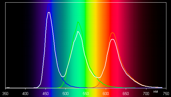 Спектры компонент (то есть спектры чистых красного, зеленого и синего цветов) хорошо разделены: