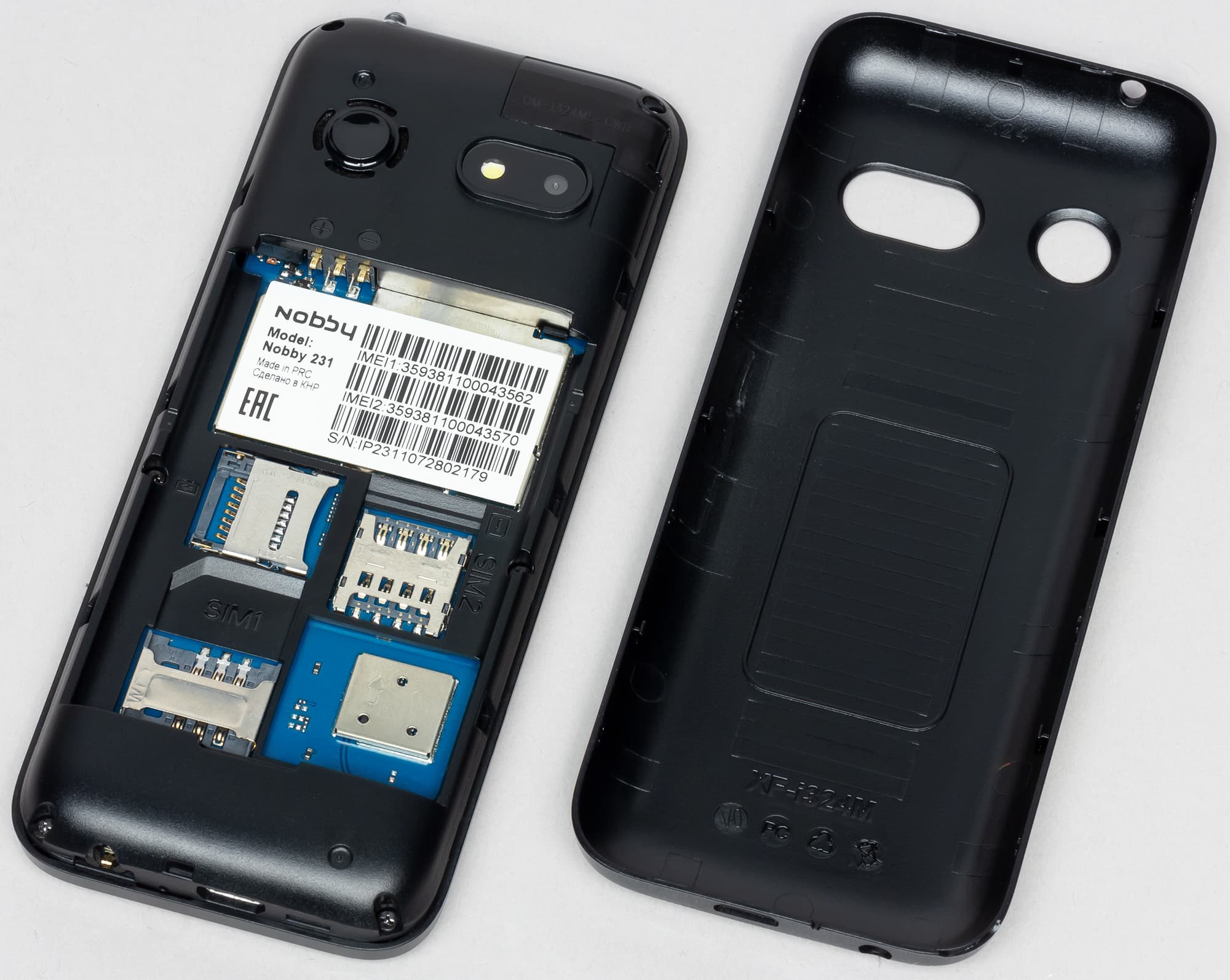 Задняя крышка снимается как в старые добрые времена — ее нужно сзади подцепить указательным пальцем за вырез в углу, уперевшись большим пальцем в центр крышки. Сняв крышку, а затем и аккумулятор, пользователь получает доступ к слотам для карточек, то есть на горячую карточки вставить/удалить/заменить в принципе не получится.