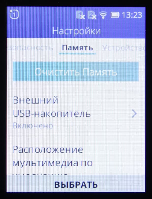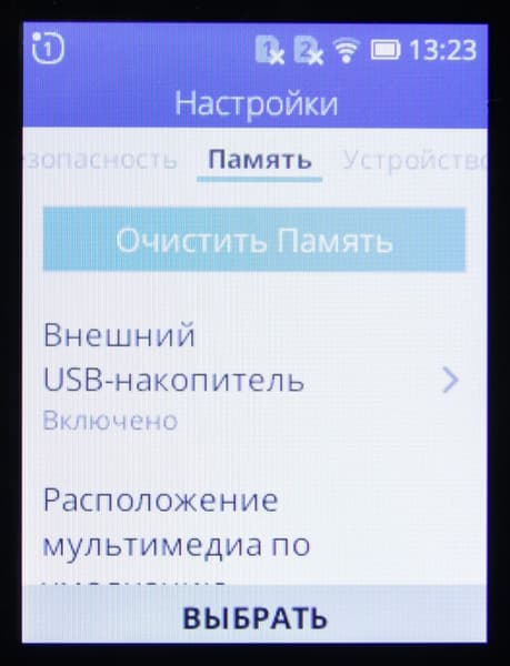 | Память | Очистка памяти, включение режима MTP, выбор места хранения по умолчанию, просмотр количества свободной/занятой памяти. |