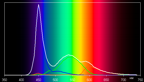 Спектр показывает большой пик синего и сильное перекрестное подмешивание компонент: