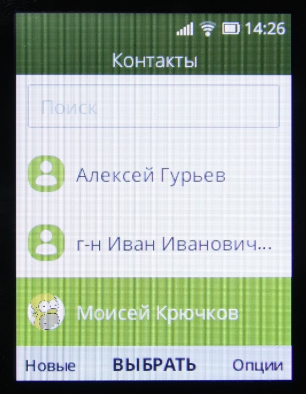 Контакты — довольно продвинутый для кнопочного телефона менеджер контактов. На каждый контакт можно завести несколько полей (в том числе несколько телефонных номеров и адресов электронной почты), но почему-то нет поля отчества. Поддерживается импорт контактов из файлов VCF, из учетных записей Google (Gmail) и Microsoft (Outlook). Есть экспорт избранных контактов в файл VCF или передача их по Bluetooth также в виде файла VCF.