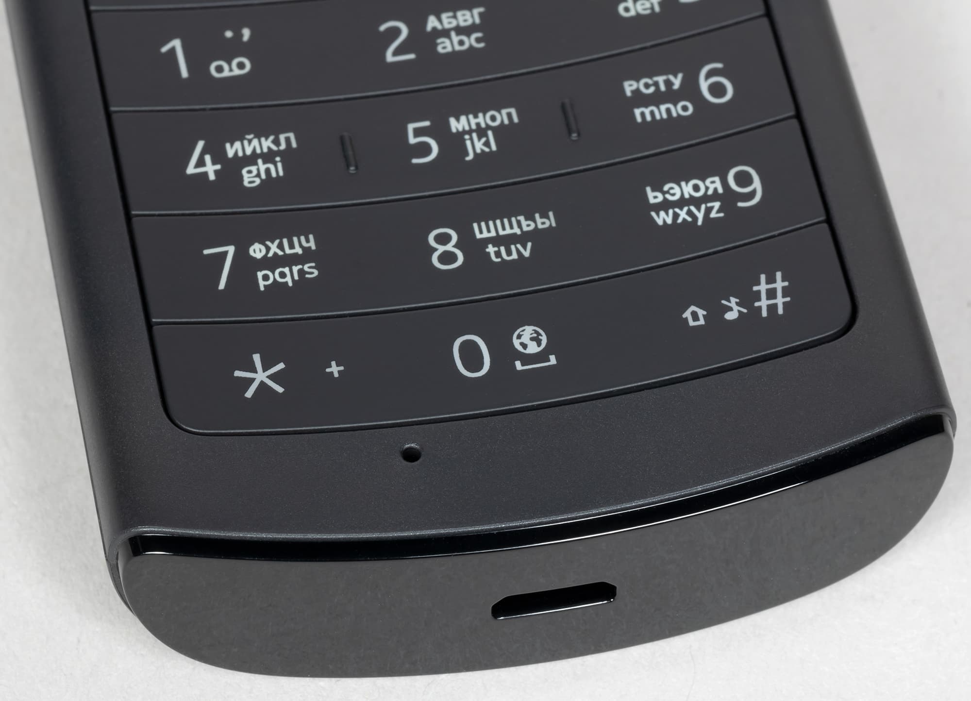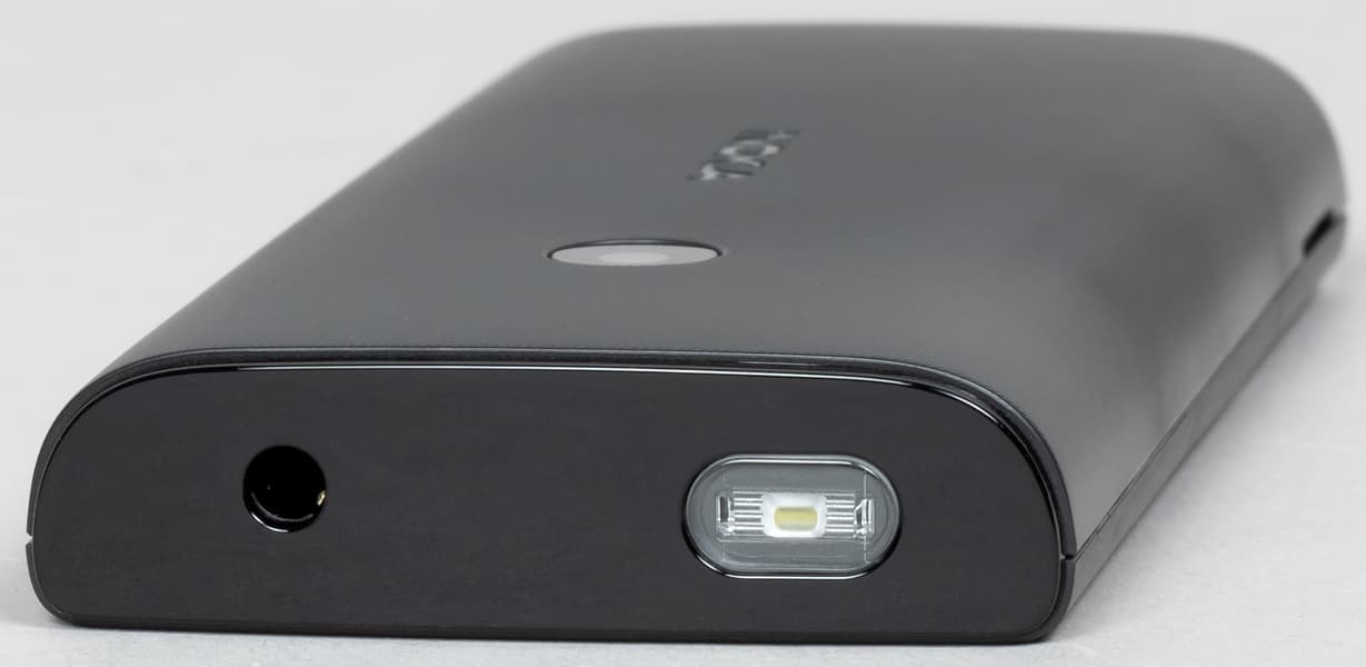 На верхнем торце находятся аудиоразъем 3,5 мм и светодиод фонарика. На нижнем — разъем Micro-USB. Отверстие микрофона — на передней панели ниже клавиатуры.