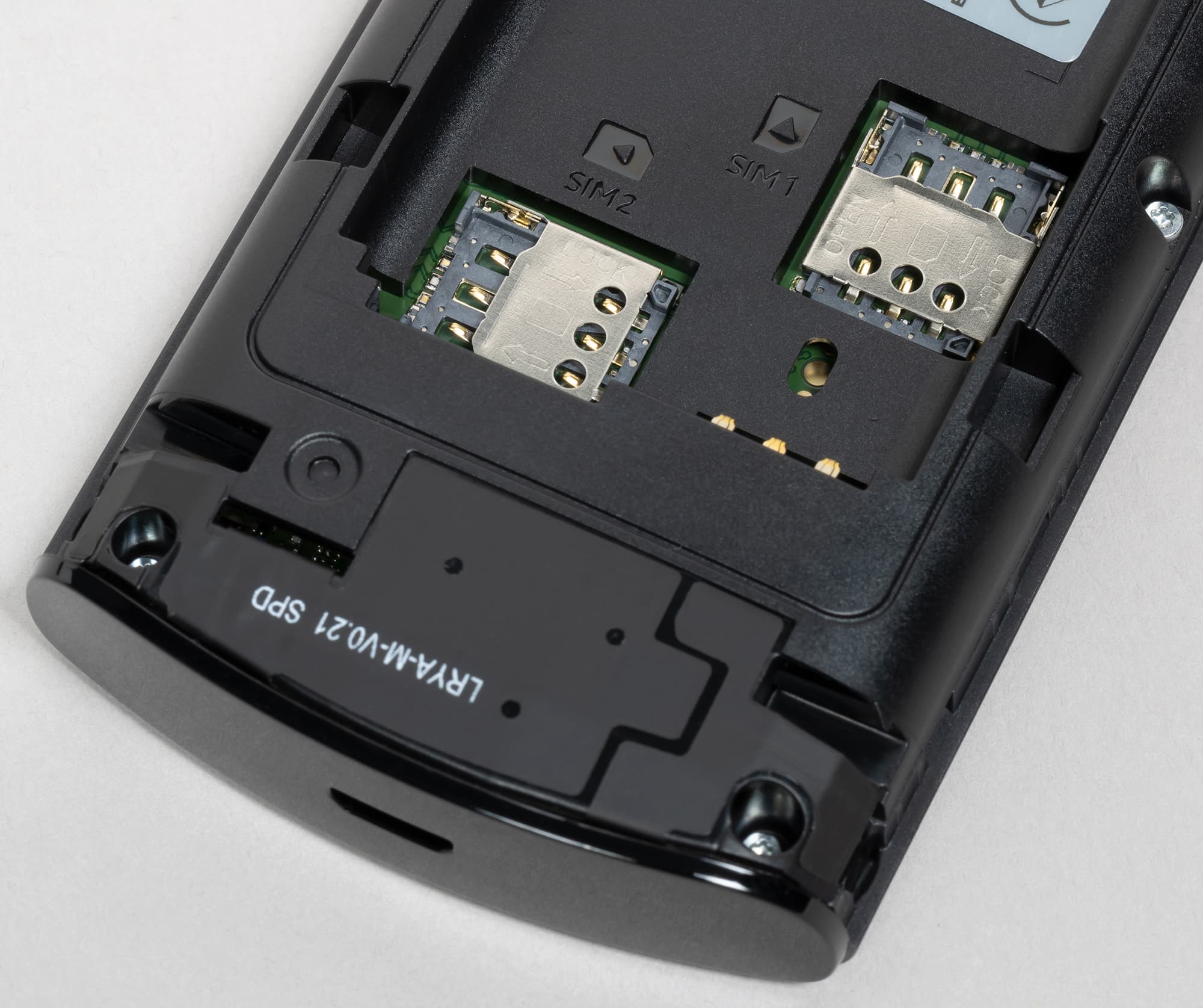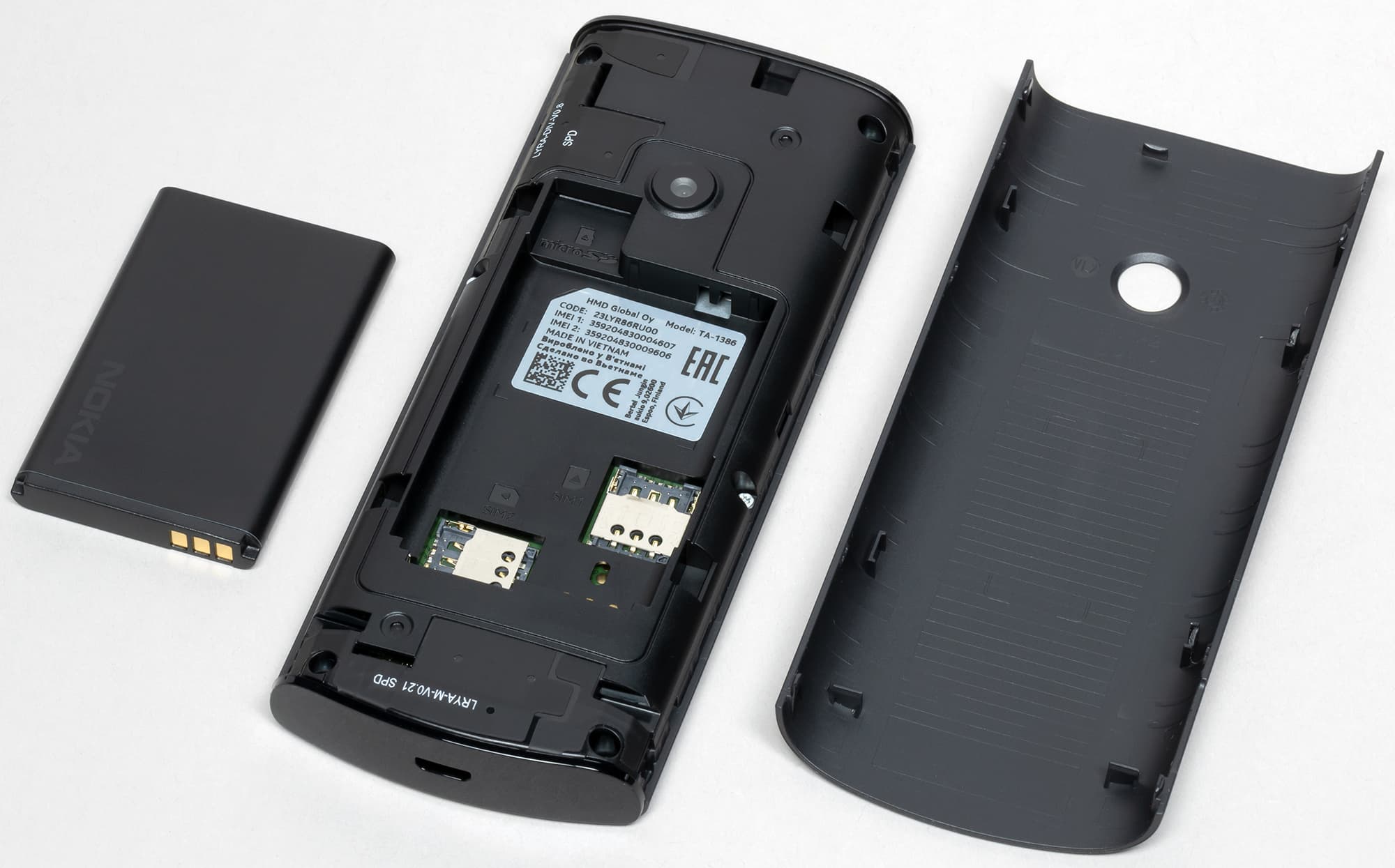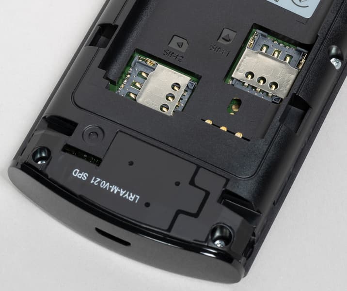 Задняя крышка снимается самым распространенным способом — ее нужно сзади подцепить и потянуть указательным пальцем за вырез в углу, уперев большой палец в центр крышки. Сняв крышку, а затем и аккумулятор, пользователь получает доступ к слотам для карточек, то есть на горячую карточки вставить/удалить/заменить в принципе не получится.