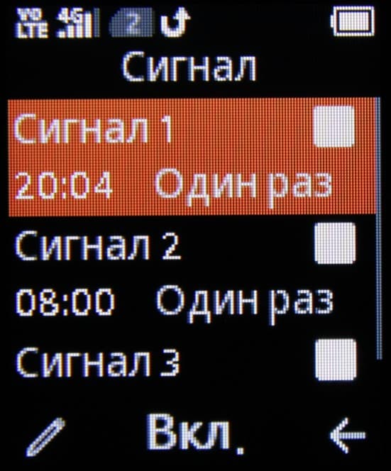 Сигнал — будильник. Можно установить три события, звук выбирается из двух предустановленных или из файла, еще его можно записать с микрофона. Отложить можно на 5 минут.