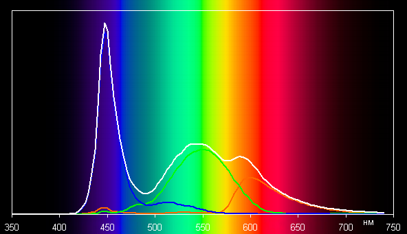 Спектр показывает большой пик синего и сильное перекрестное подмешивание компонент: