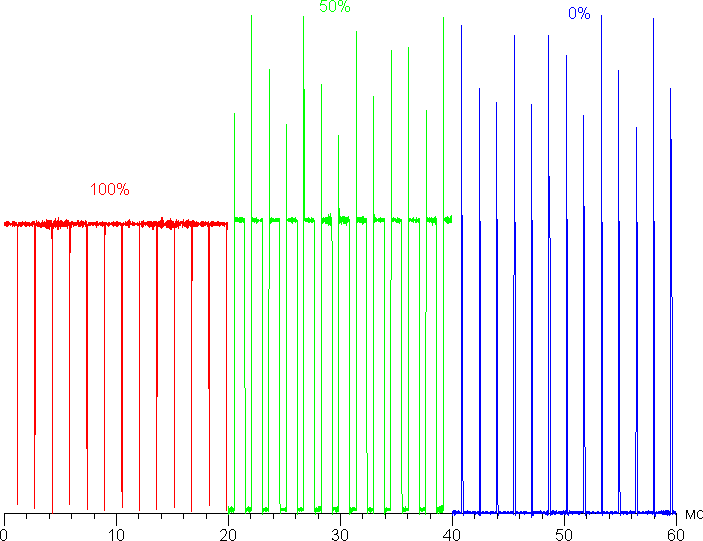 Зачем-то используется внешнее защитное стекло, но оно хоть минеральное, поэтому царапается небыстро. Это стекло также создает воздушный промежуток между собой и собственно ЖК-матрицей. Этот промежуток снижает антибликовые свойства экрана, что в совокупности с не очень высокой яркостью осложняет использование телефона на улице солнечным днем. Хотя нельзя сказать, что на солнце экран совсем не читаем — достаточно выставить яркость на максимум и повернуть экран так, чтобы в нем отражалось что-то темное, тогда все более-менее видно. Максимальная яркость достигает 380 кд/м². Минимальное значение яркости — 30 кд/м². В полной темноте яркость можно понизить до комфортного значения. Яркость регулируется с помощью ШИМ с частотой 642 Гц. Глазами мерцания не видно, но все-таки частота не очень высокая, поэтому в тесте на стробоскопический эффект наличие модуляции выявляется. Графики зависимости яркости (вертикальная ось) от времени (горизонтальная ось) при различных значениях настройки яркости: