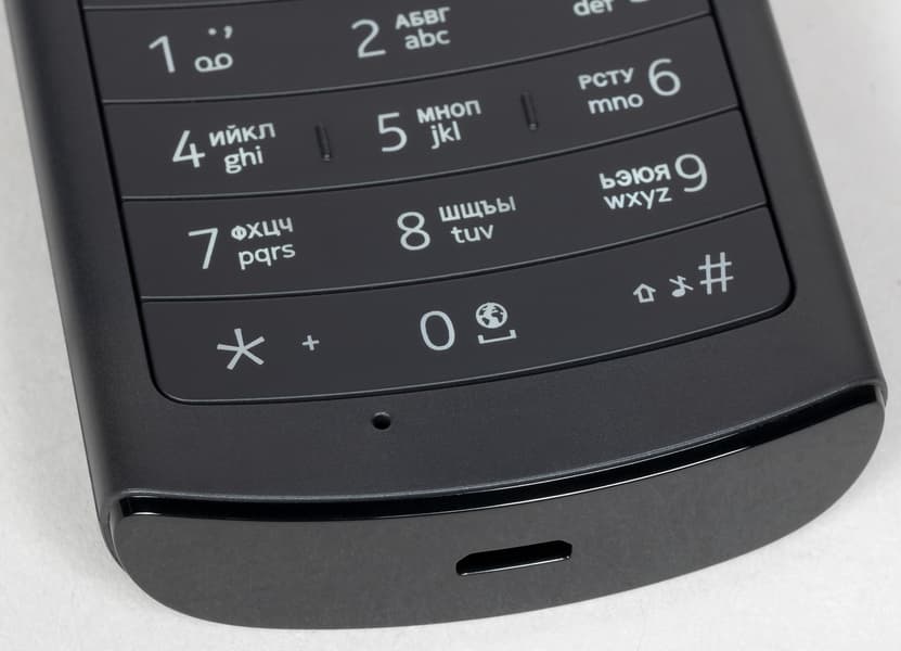 То, что эта кнопка утоплена и обрамлена квадратом сильно снижает вероятность ее случайного нажатия, что важно, так как для разблокировки телефона нужно сначала нажать именно на эту кнопку. Ход кнопок небольшой и не маленький, усилие нажатия оптимальное — не туго, но и нет тенденции к ложным нажатиям, например, когда телефон находится в заднем кармане джинсов. Момент срабатывания тактильно четко ощущается, при этом раздается приглушенный щелчок. Курсорная кнопка-квадрат хорошо отрабатывает нажатия вправо-влево и вверх-вниз. Вообще на все кнопки удобно нажимать даже большим пальцем средней по размеру руки. Поверхности кнопок практически не бликуют, обозначения достаточно контрастные, но буквы, конечно, мелковаты. В темноте использование телефона облегчает достаточно яркая и равномерная подсветка, которая белым подсвечивает все обозначения на кнопках. Включается подсветка при нажатии на любую клавишу.