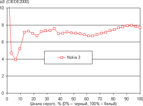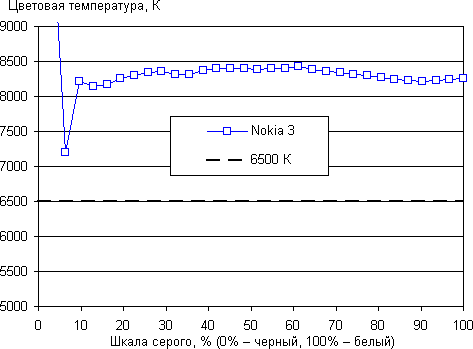 В итоге визуально цвета на этом экране почти не отличаются от естественных. Баланс оттенков на шкале серого не очень хороший, так как цветовая температура существенно выше стандартных 6500 К, но отклонение от спектра абсолютно черного тела (ΔE) ниже 10, что для потребительского устройства считается приемлемым показателем. При этом цветовая температура и ΔE несильно изменяются от оттенка к оттенку — это положительно сказывается на визуальной оценке цветового баланса. (Самые темные области шкалы серого можно не учитывать, так как там баланс цветов не имеет большого значения, да и погрешность измерений цветовых характеристик на низкой яркости большая.)