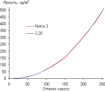 Контрастность (примерно в центре экрана) высокая — порядка 1050:1. Время отклика при переходе черный-белый-черный равно 22 мс (11 мс вкл. + 11 мс выкл.). Переход между полутонами серого 25% и 75% (по численному значению цвета) и обратно в сумме занимает 33 мс. Построенная по 32 точкам с равным интервалом по численному значению оттенка серого гамма-кривая не выявила завала ни в светах, ни в тенях. Показатель аппроксимирующей степенной функции равен 2,20, что равно стандартному значению 2,2, но в данном случае это не имеет особого значения. При этом реальная гамма-кривая несколько отклоняется от степенной зависимости: