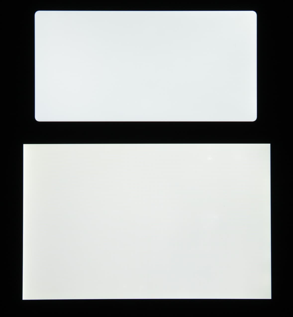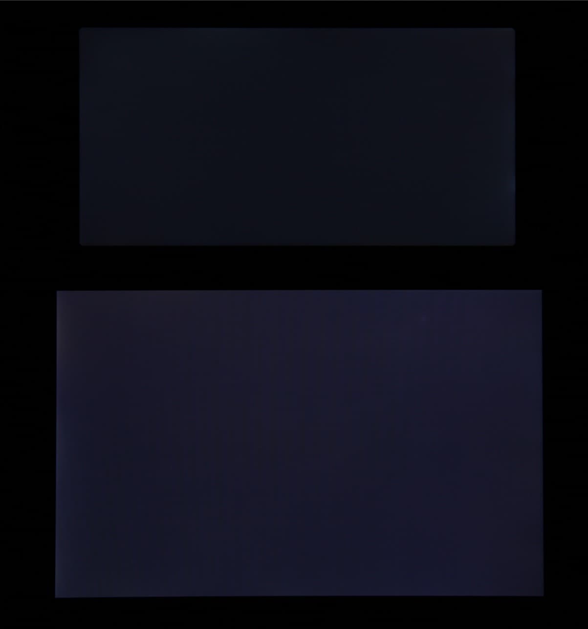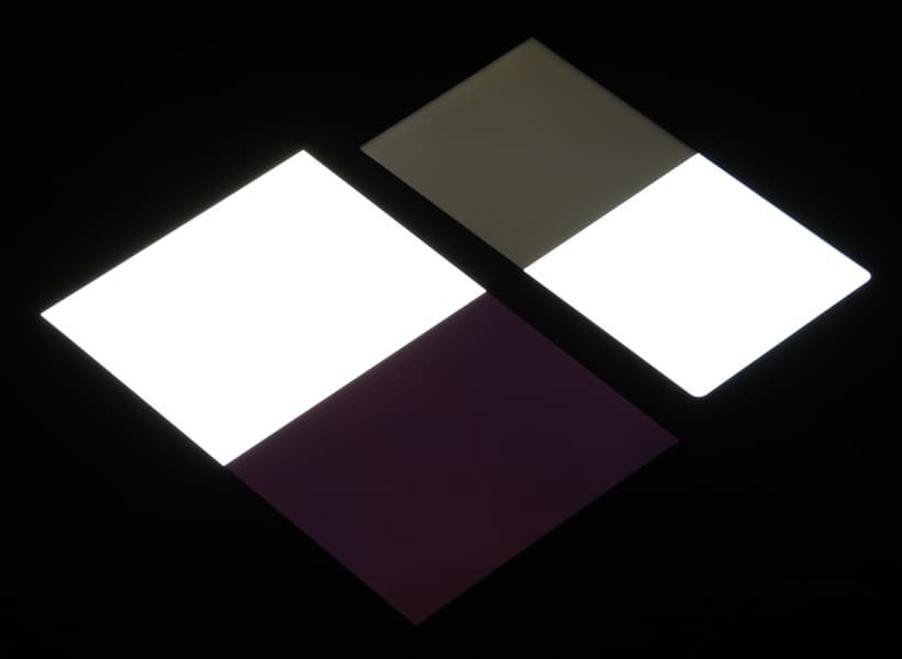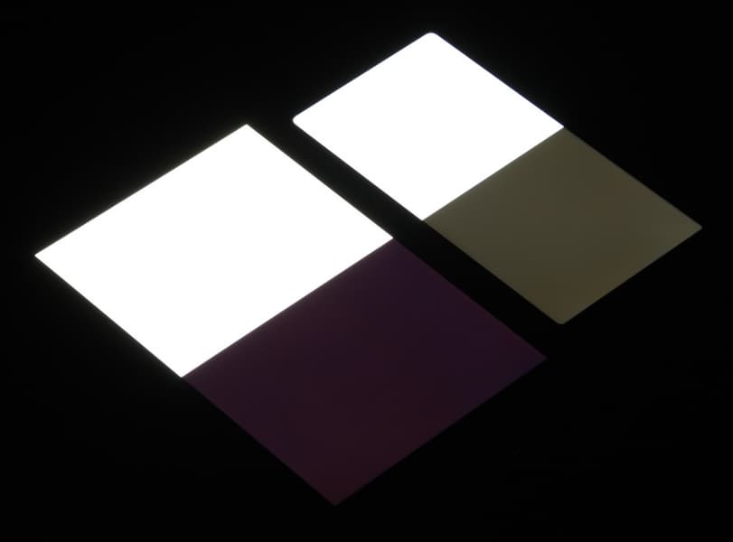 Черное поле при отклонении по диагонали сильно высветляется, но остается условно нейтрально-серым. Фотографии ниже это демонстрируют (яркость белых участков в перпендикулярном плоскости экранов направлении одинаковая!):