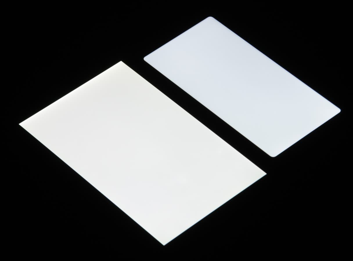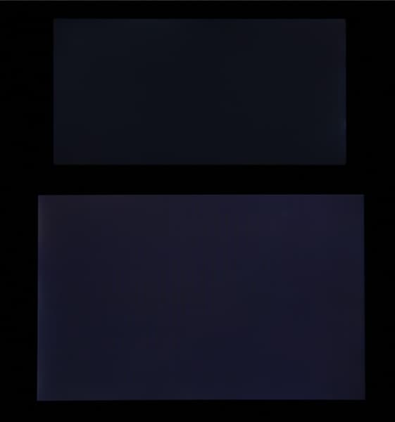 При перпендикулярном взгляде равномерность черного поля средняя, местами ближе к краю черный слегка высветлен (для наглядности яркость подсветки на смартфоне выведена на максимум):