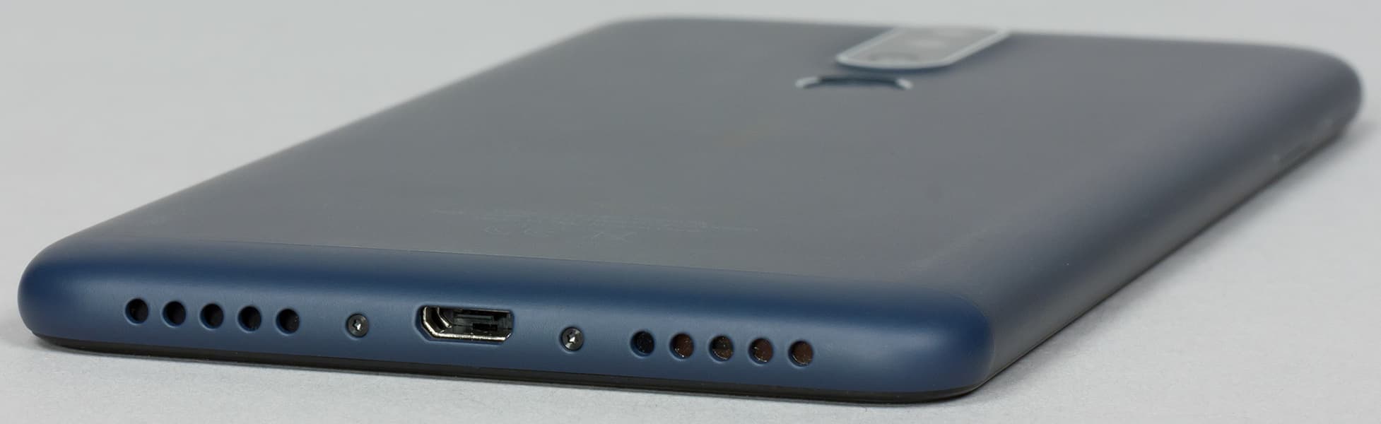В нижнем торце USB представлен, к сожалению, не актуальным разъемом Type-C, как в Nokia 5.1 Plus, а несимметричным и медленным Micro-USB, и это несомненный минус. Сюда же, в нижний торец, выведен и громкоговоритель, причем зачем-то проделано два ряда отверстий, хотя динамик тут один. Если за вторым скрывается разговорный микрофон, то зачем ему целых пять отверстий?