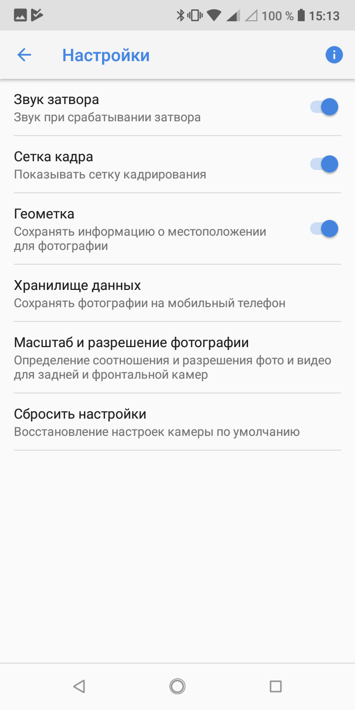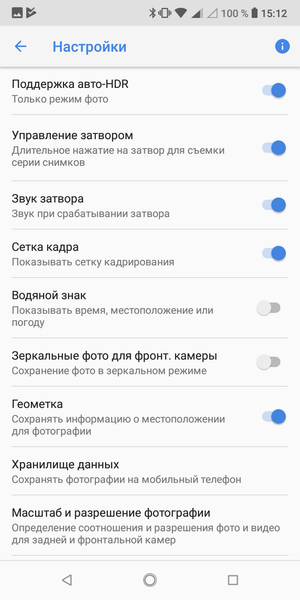 Набор настроек камеры состоит из прокручивающегося списка режимов снизу и отдельного свитка с настройками. В режиме ручных настроек нет регулировки ни светочувствительности, ни скорости затвора, зато есть варианты фокусировки (центровзвешенный, оценочный), которые обычно никто никогда не трогает, выбор фокусного расстояния (бесконечность, макро), а также экспокоррекция и исправление баланса белого. Есть авто-HDR и режим с размытием фона. Штатной возможности сохранения снимков в RAW нет.