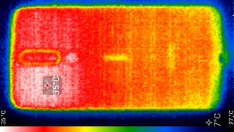 Нагрев больше в верхней части аппарата ближе к правому краю, что, видимо, соответствует расположению микросхемы SoC. По данным теплокамеры, максимальный нагрев составил 35 градусов (при температуре окружающего воздуха в 24 градуса), это относительно немного.