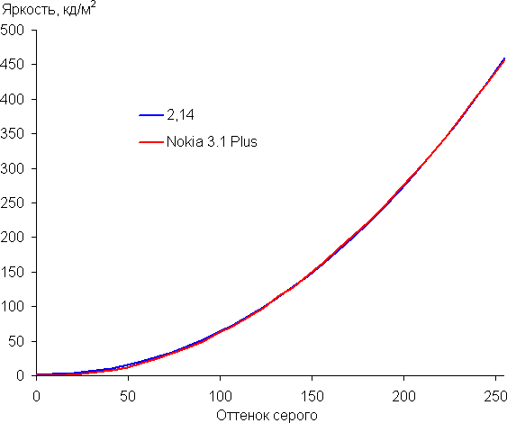 Контрастность (примерно в центре экрана) высокая — порядка 1800:1. Время отклика при переходе черный-белый-черный равно 29 мс (17 мс вкл. + 12 мс выкл.). Переход между полутонами серого 25% и 75% (по численному значению цвета) и обратно в сумме занимает 48 мс. Построенная по 32 точкам с равным интервалом по численному значению оттенка серого гамма-кривая не выявила завала ни в светах, ни в тенях. Показатель аппроксимирующей степенной функции равен 2,14, что немного ниже стандартного значения 2,2. При этом реальная гамма-кривая мало отклоняется от степенной зависимости: