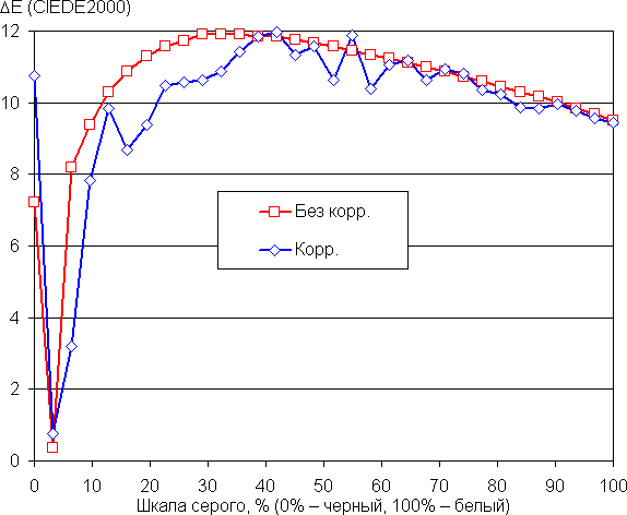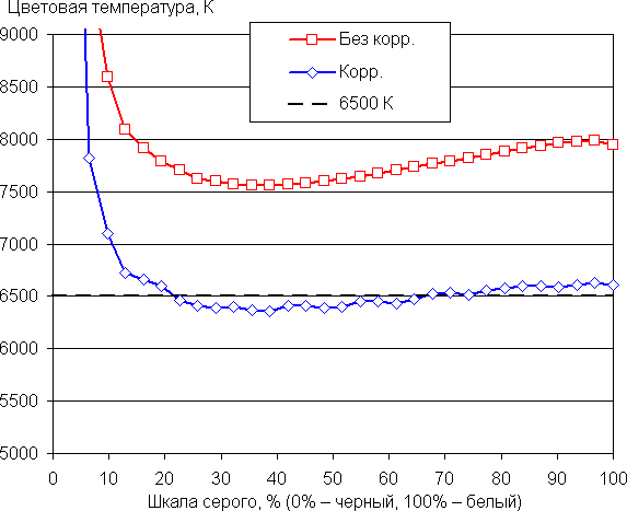 По умолчанию баланс оттенков на шкале средний, так как цветовая температура существенно выше стандартных 6500 К. После коррекции (ползунок Интенсивность на минимуме, результат представлен на графиках ниже) баланс становится лучше: цветовая температура теперь близка к 6500 К. При этом отклонение от спектра абсолютно черного тела (ΔE) на большей части шкалы серого все равно выше 10, что даже для потребительского устройства считается не очень хорошим показателем. Однако цветовая температура и ΔE мало изменяются от оттенка к оттенку — это положительно сказывается на визуальной оценке цветового баланса. (Самые темные области шкалы серого можно не учитывать, так как там баланс цветов не имеет большого значения, да и погрешность измерений цветовых характеристик на низкой яркости большая.)