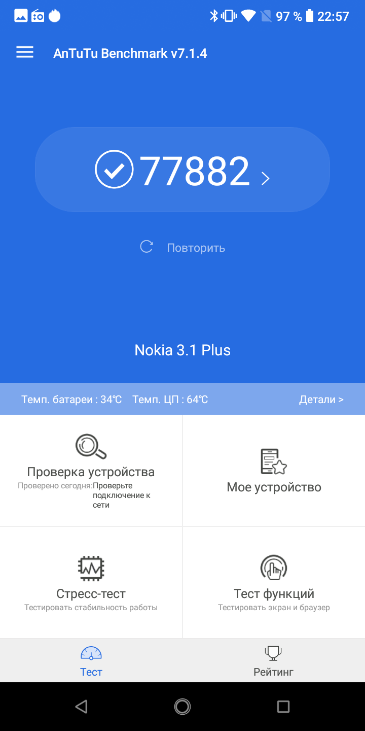 Несъемная аккумуляторная батарея, установленная в Nokia 3.1 Plus, имеет неплохую емкость в 3500 мА·ч. Раньше платформы MediaTek экономичностью не славились, но новый техпроцесс, очевидно, сделал свое дело: новый смартфон демонстрирует высокий уровень автономности во всех сценариях работы. В реальной жизни аппарат легко доживает до вечерней зарядки, спокойно проживает сутки, может протянуть и двое при бережном подходе.