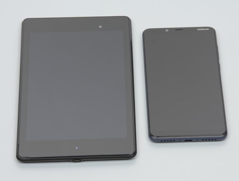 Лицевая поверхность экрана выполнена в виде стеклянной пластины с зеркально-гладкой поверхностью, устойчивой к появлению царапин. Судя по отражению объектов, антибликовые свойства экрана лучше, чем у экрана Google Nexus 7 (2013) (далее просто Nexus 7). Для наглядности приведем фотографию, на которой в выключенных экранах отражается белая поверхность (слева — Nexus 7, справа — Nokia 3.1 Plus, далее их можно различать по размеру):