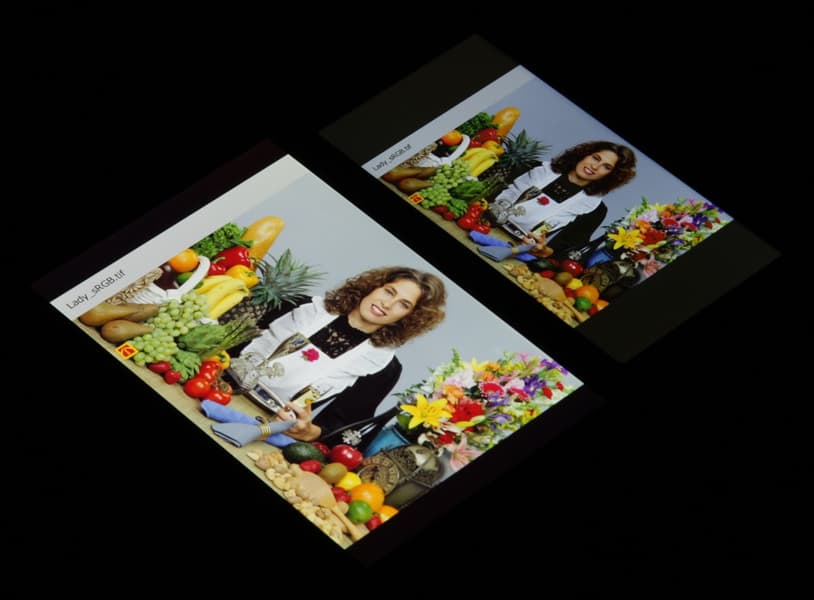 Экран имеет хорошие углы обзора без значительного сдвига цветов даже при больших отклонениях взгляда от перпендикуляра к экрану и без инвертирования (кроме самых-самых темных при отклонении по одной диагонали) оттенков. Для сравнения приведем фотографии, на которых на экраны Nokia 3.1 Plus и Nexus 7 выведены одинаковые изображения, при этом яркость экранов изначально установлена примерно на 200 кд/м², а цветовой баланс на фотоаппарате принудительно переключен на 6500 К.
