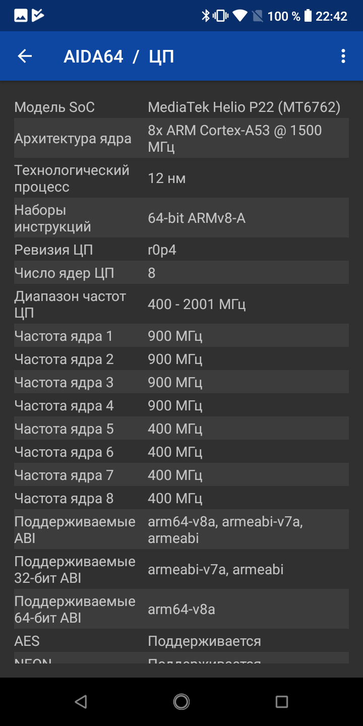 - SoC MediaTek Helio P22, 8 ядер (8×Cortex-A53 @2,0 ГГц)